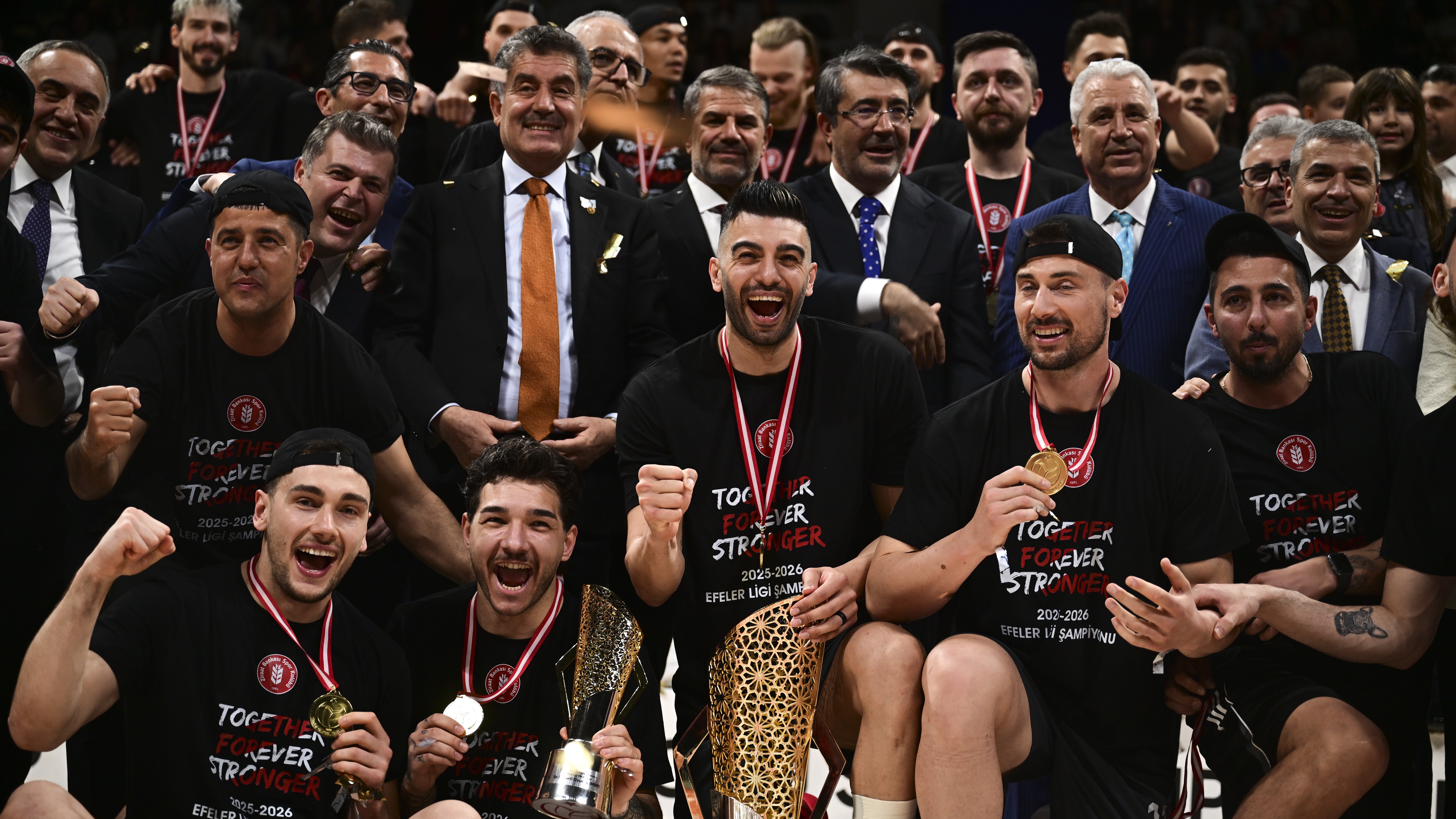 Kulüp tarihinin 5'inci lig şampiyonluğuna ulaşan Ziraat Bankkart oyuncuları, törende "Beraber, daima, daha güçlü" yazan tişörtler giydi.
