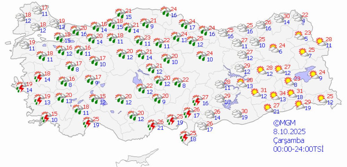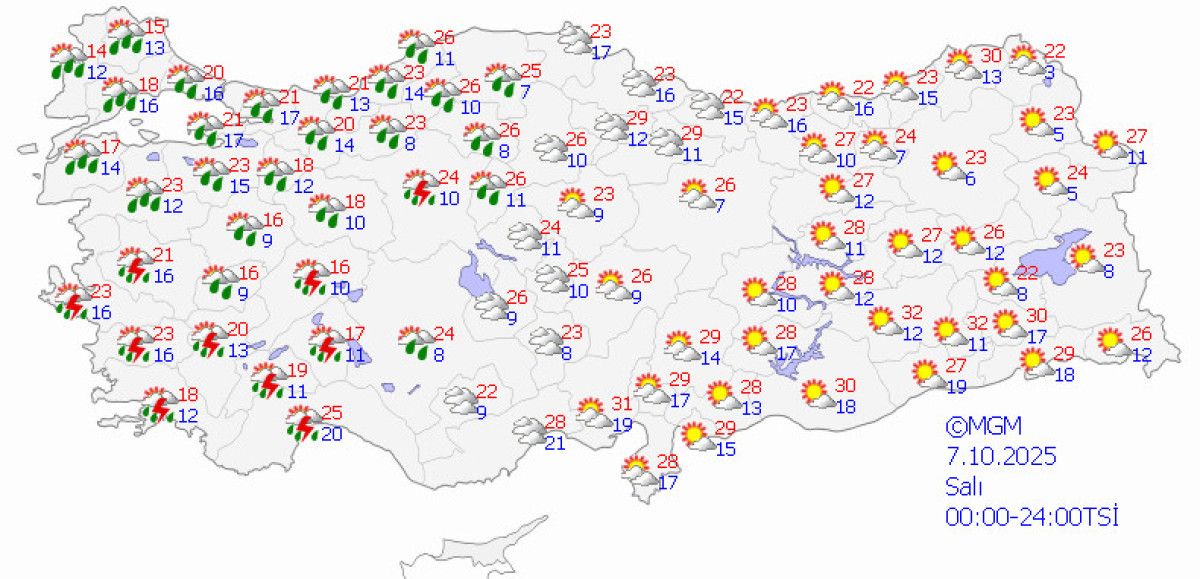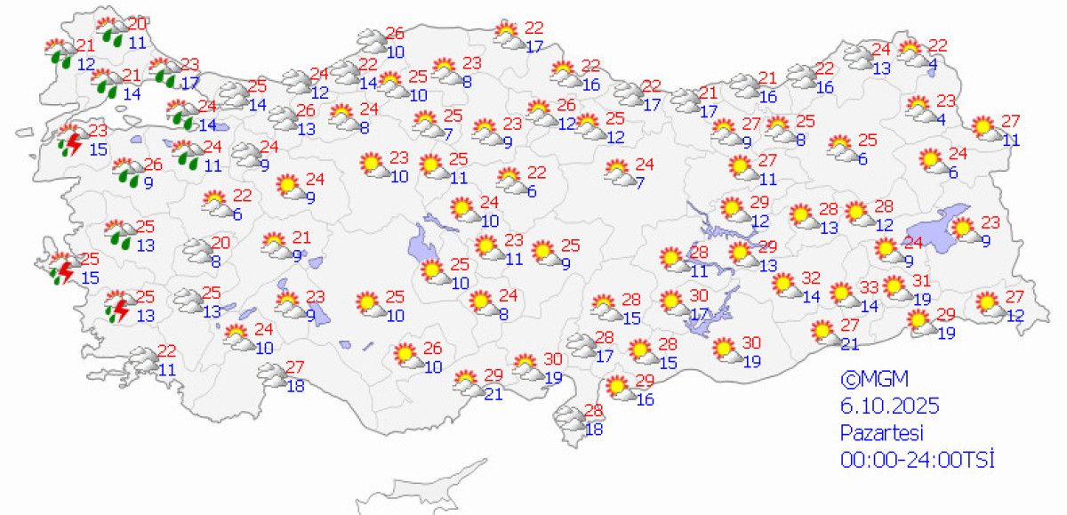 Meteoroloji Genel Müdürlüğü'nün (MGM) hava durumu haritalarına göre, ülke genelinde sıcaklıklar genellikle 20-30 derece aralığında, yer yer 33 dereceye ulaşacak şekilde normallerin üzerinde olacak.