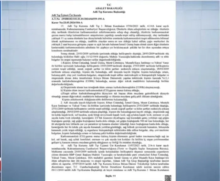 Bu rapora ulaşmanız çok önemli. Çünkü bizim baştan beri iki iddiamız vardı. Bu olayın suikast olduğu, bu suikastın türbülans sebebiyle meydana geldiği ya da karbonmonoksit ile zehirlenerek kazaya sebebiyet verdiği noktasında iddialarımız vardı. Baştan beri bu iddialarımız vardı. Ama ne yazık ki olaydan hemen sonra Çukurova Üniversitesi'nden aldırdığımız raporda karbonmonoksite rastlanmadığı hususu dile getirilmişti. Daha sonra Devlet Denetleme Kurulu tarafından Adli Tıp'tan bu inceleme istendi ve Adli Tıp karbonmonoksitin olduğunu ama 15 ay sonra inceleme yaptıkları için kanlarda bu oranın artmış olabileceği konusunda bir görüş de belirtti. Biz buna tabi itiraz etmiştik. Karbonmonoksitin 15 ay kalmasıyla artmayacağı bilakis eksileceği noktasında bilirkişi raporları aldırmıştık.